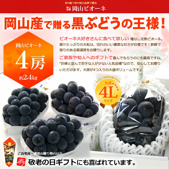内容 岡山ピオーネ4L×4房(約2.4kg) 産地 岡山県 賞味期限 当店発送後5日前後 ※生ものですので到着後は早めにお召し上がり下さい。