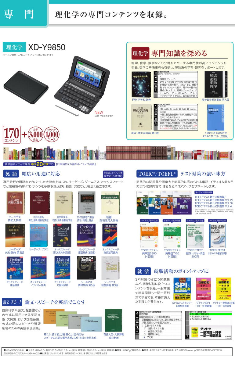 XD-Y9850 カシオ電子辞書 CASIO エクスワード 理化学モデル 製品仕様 品番 XD-Y9850 表示 5.3型タッチパネル(5.0型 528×320ドット TFTカラー液晶) 外形寸法 幅148.0×奥行105.5×高さ15.7mm(閉時、最薄部) 高さ18.5mm(閉時、最厚部) 質量 約265g(電池込み) 本体メモリー 約100MB 電源 ・単3形アルカリ乾電池LR6(AM3)2本または単3形eneloop(エネループ)2本または単3形充電式EVOLTA(エボルタ)2本 ・パソコンや別売USB-ACアダプターからのUSB給電 付属品 タッチペン1本、専用USBケーブル、単3形アルカリ乾電池2本 特徴 【理化学】専門知識を深める 物理、化学、数学などの分野をカバーする専門性の高いコンテンツを収録しています。