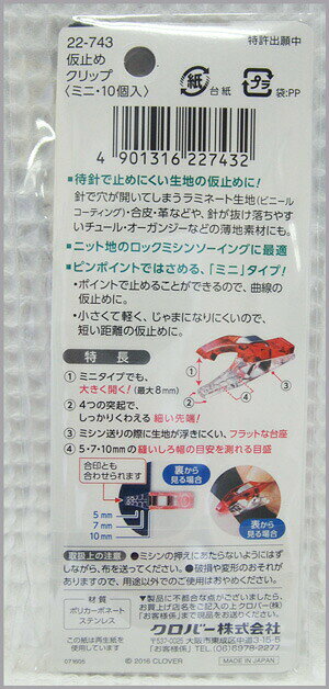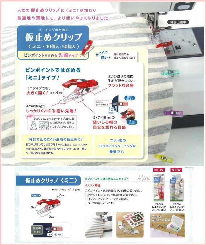 ソーイングのための【仮止めクリップ・ミニ/10個入り】待針で止めにくい生地の仮止めに使うクリップです。ピンポイントで止める先細タイプ