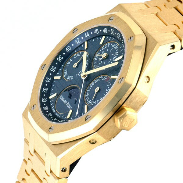 商品詳細 【ジャンル】腕時計 / watch メンズ時計【ブランド】オーデマピゲ / AUDEMARSPIGUET【商品名】ロイヤルオーク パーペチュアルカレンダー【型番】26574BA.OO.1220BA.01【シリアル】J*****【素材】イエローゴールド【文字盤】ブルー【ベゼル】イエローゴールド【ベルト】イエローゴールド【ムーブメント】自動巻き(Cal.5134)【ランク】A【状態】・僅かな小傷がございます・風防や文字盤に肉眼で確認できるダメージはございません・ムーブメント点検済み【サイズ】ベルト長さ/約19.5cmケース 縦/約41mm 横/約44mm(リューズ含む) 厚み/約9.5mm【備考】20m防水 永久カレンダー サファイヤクリスタル風防 シースルーバック【付属品】メーカー保証書(2018年1月国内購入) 専用箱 冊子 工具【コメント】ラグジュアリースポーツモデルの頂きのひとつ"ロイヤルオーク"。